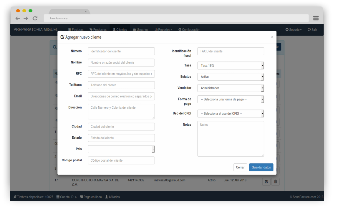 Datos fiscales de la empresa como Razón social, RFC, dirección, etc.